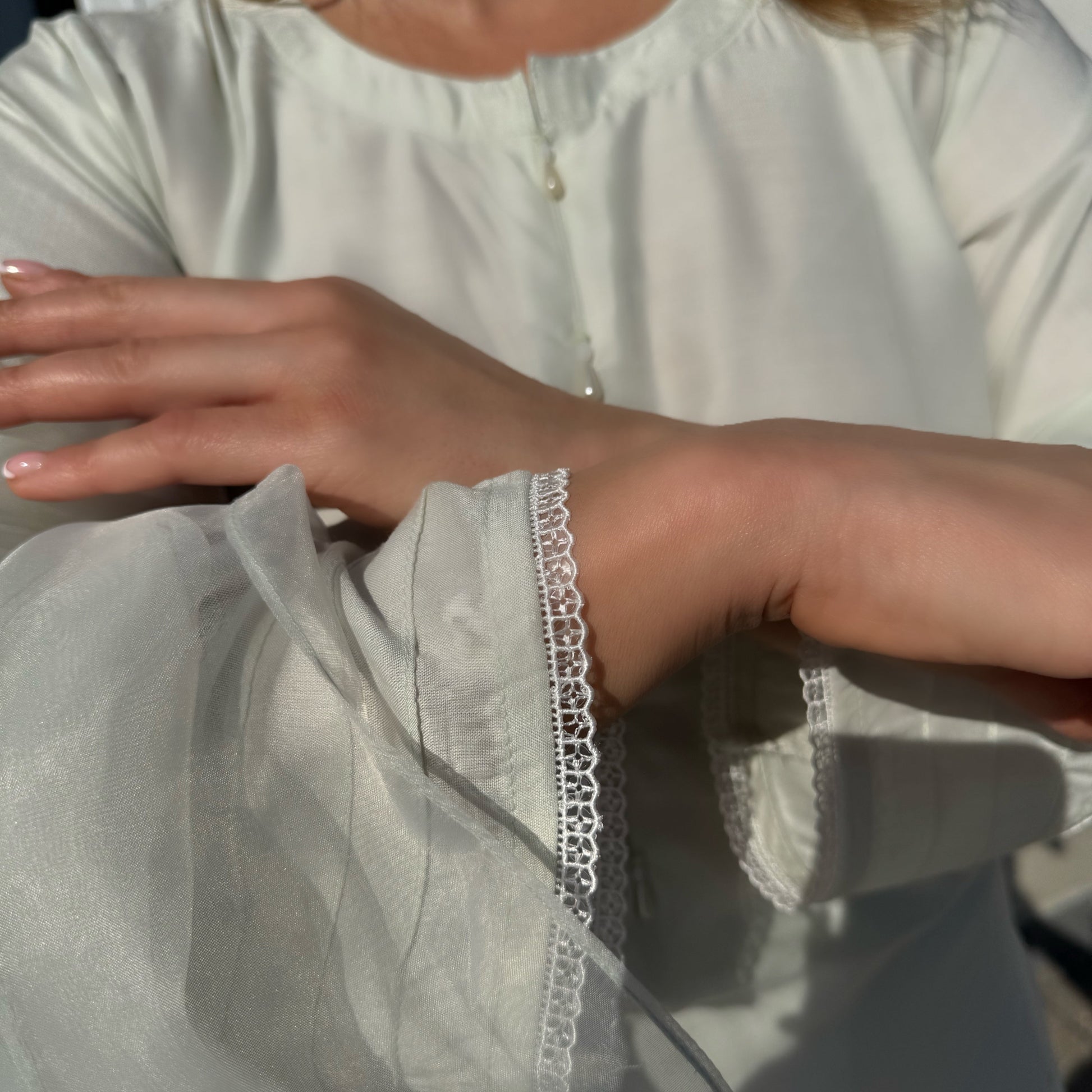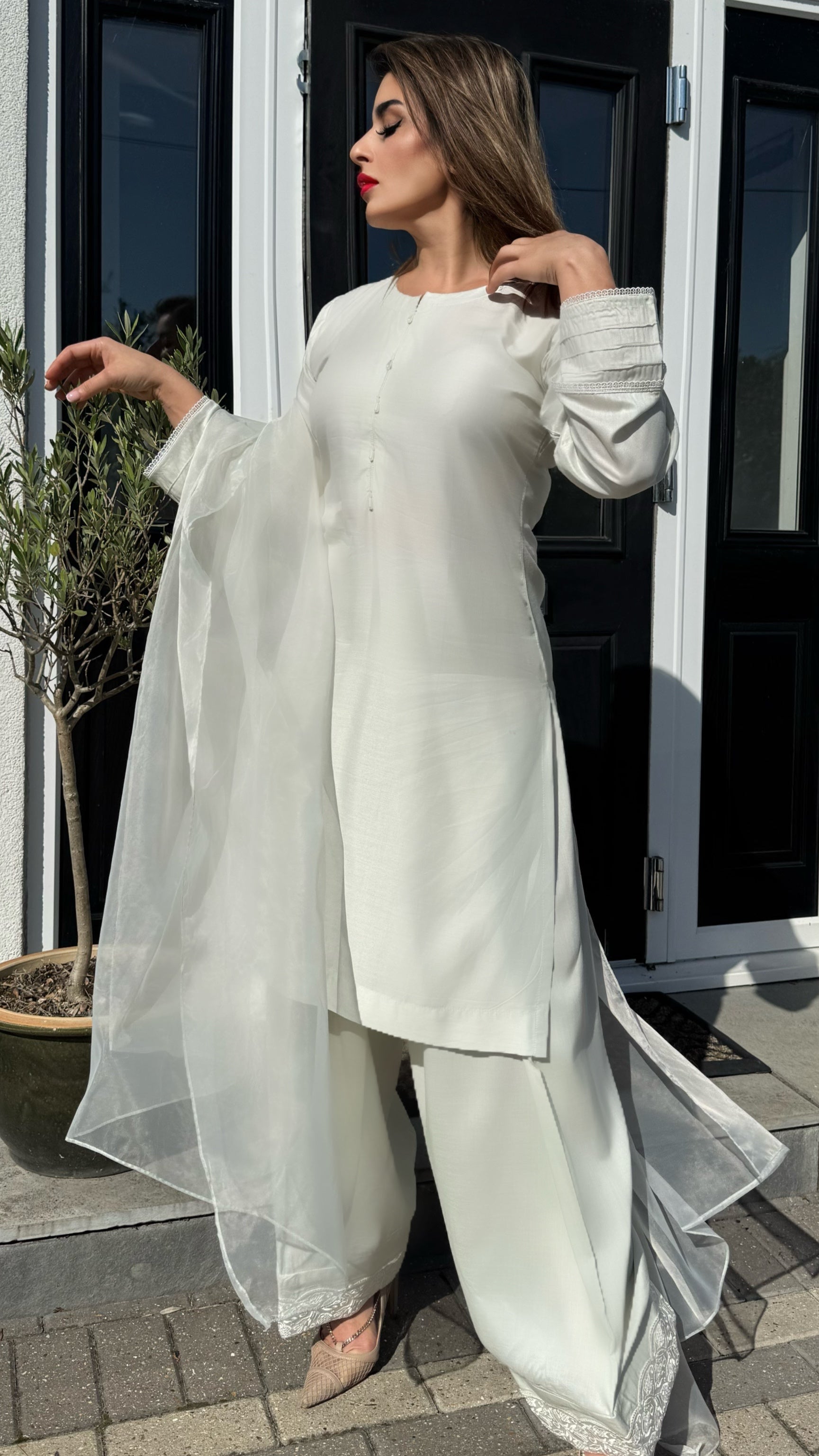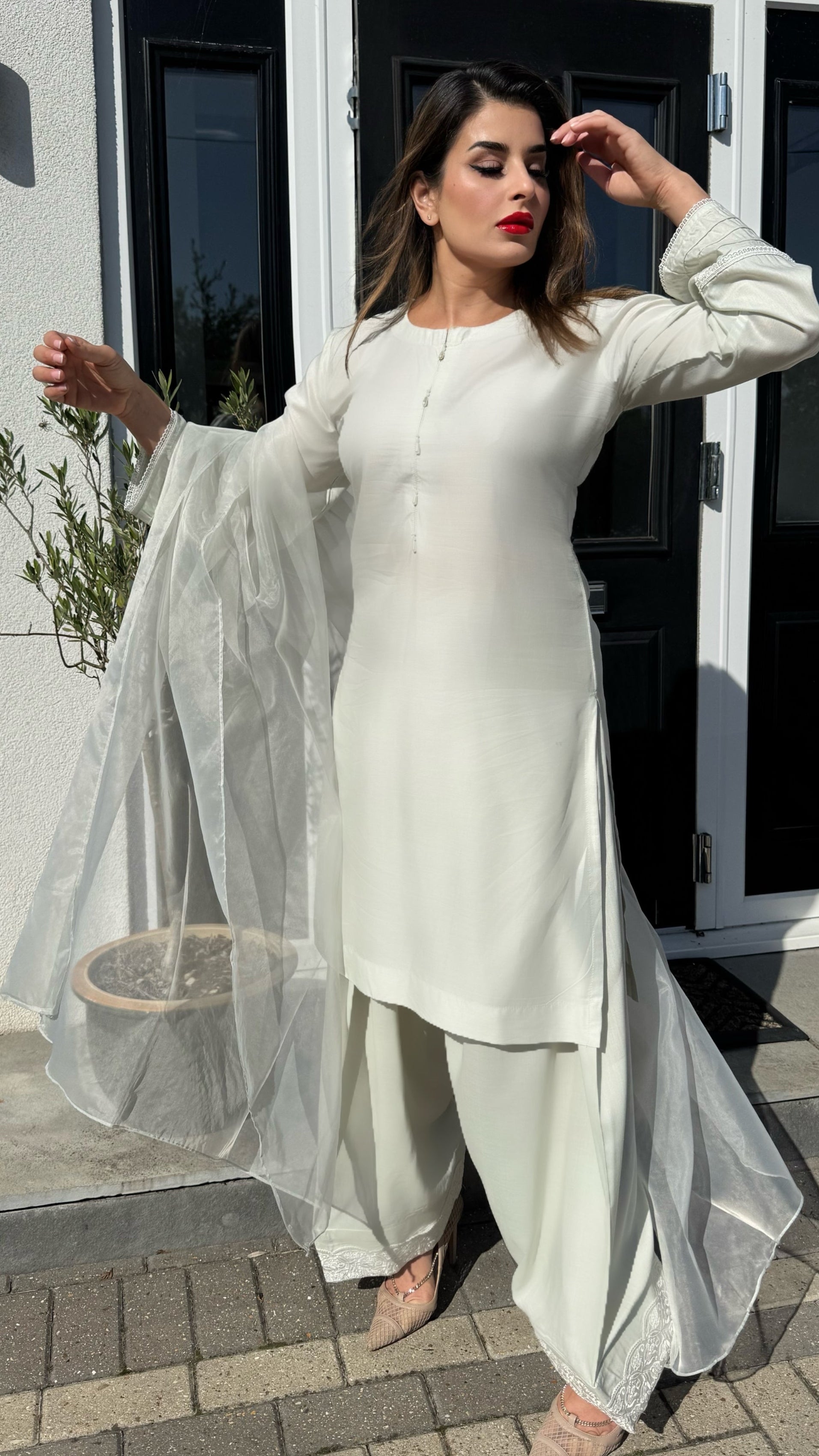 Step into elegance with Chandni Farshi, meaning moonlight, a three-piece suit designed to embody grace and radiance. Crafted from a satin-cotton blend in pristine white, this ensemble captures the soft glow of moonlight with every movement.