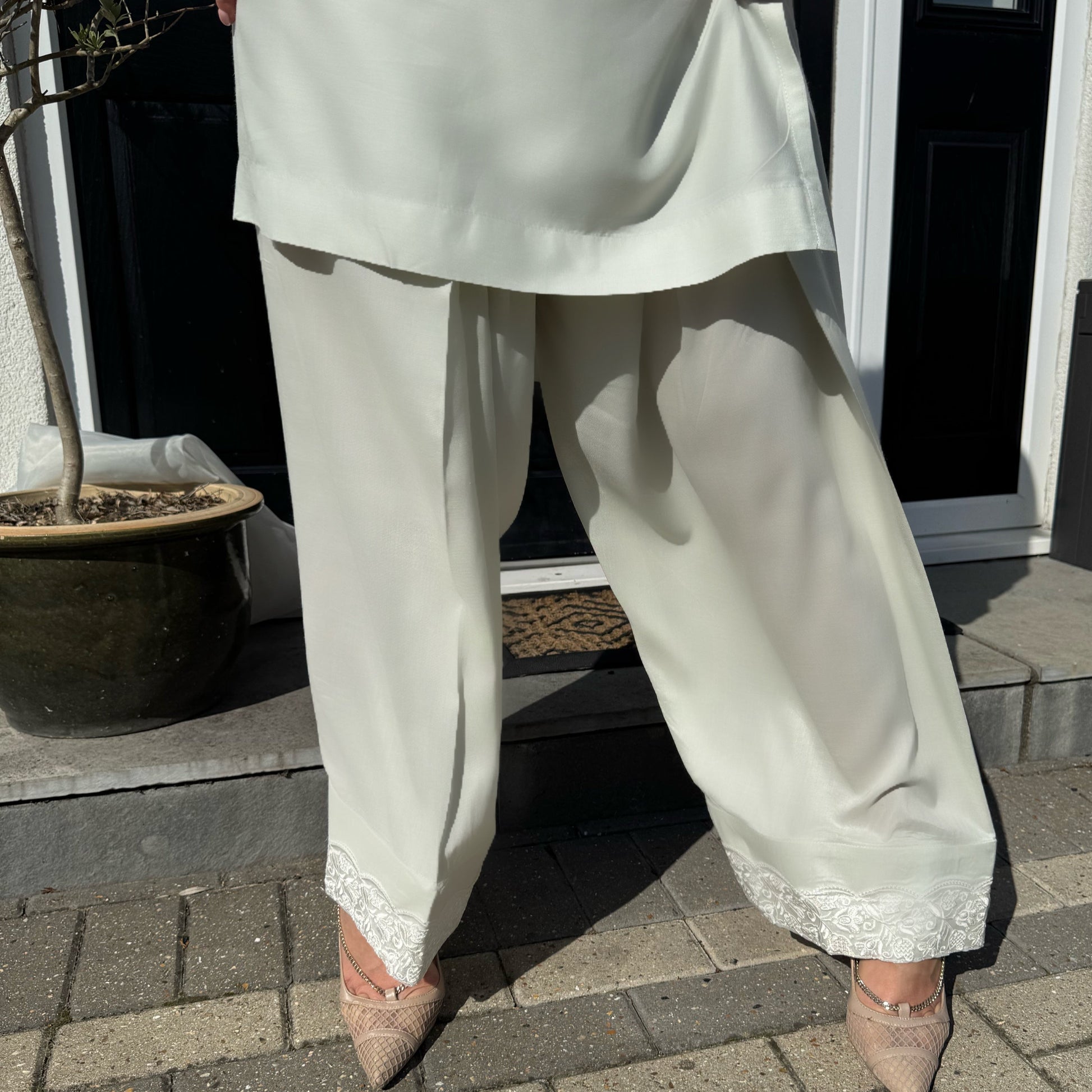 Farshi Shalwar: Flowing and regal, detailed with a stunning handcrafted border that elevates its timeless beauty.