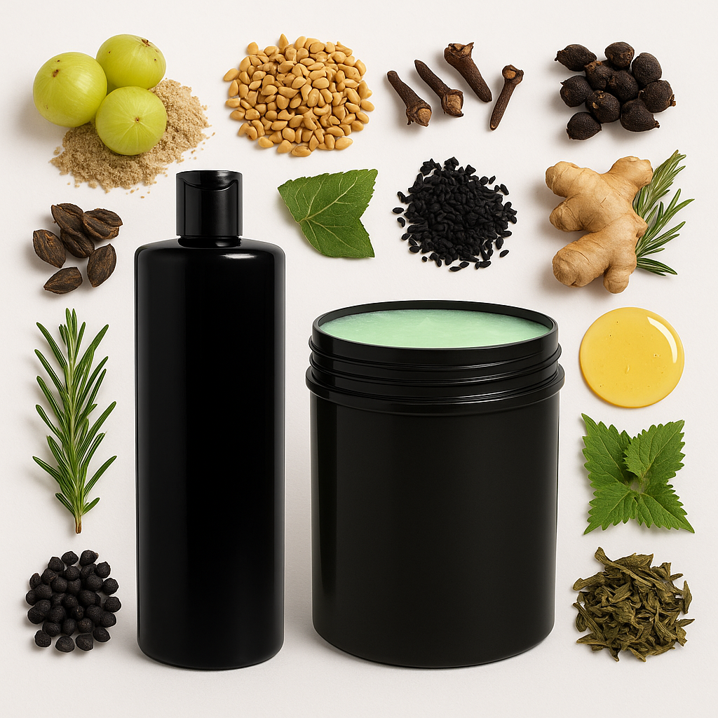 - Scalp health + dandruff control: ginger, rosemary, black seed, sea salt