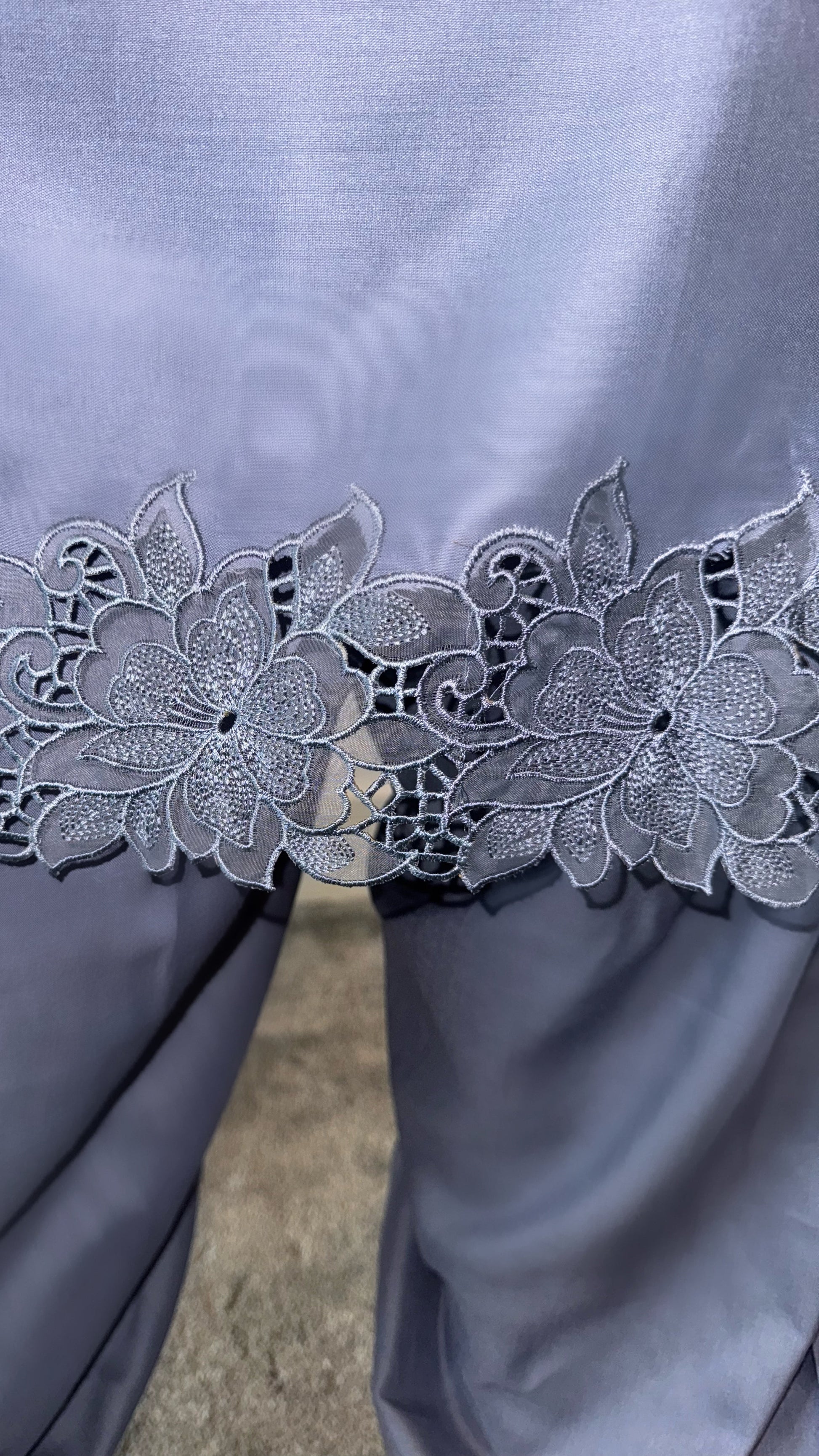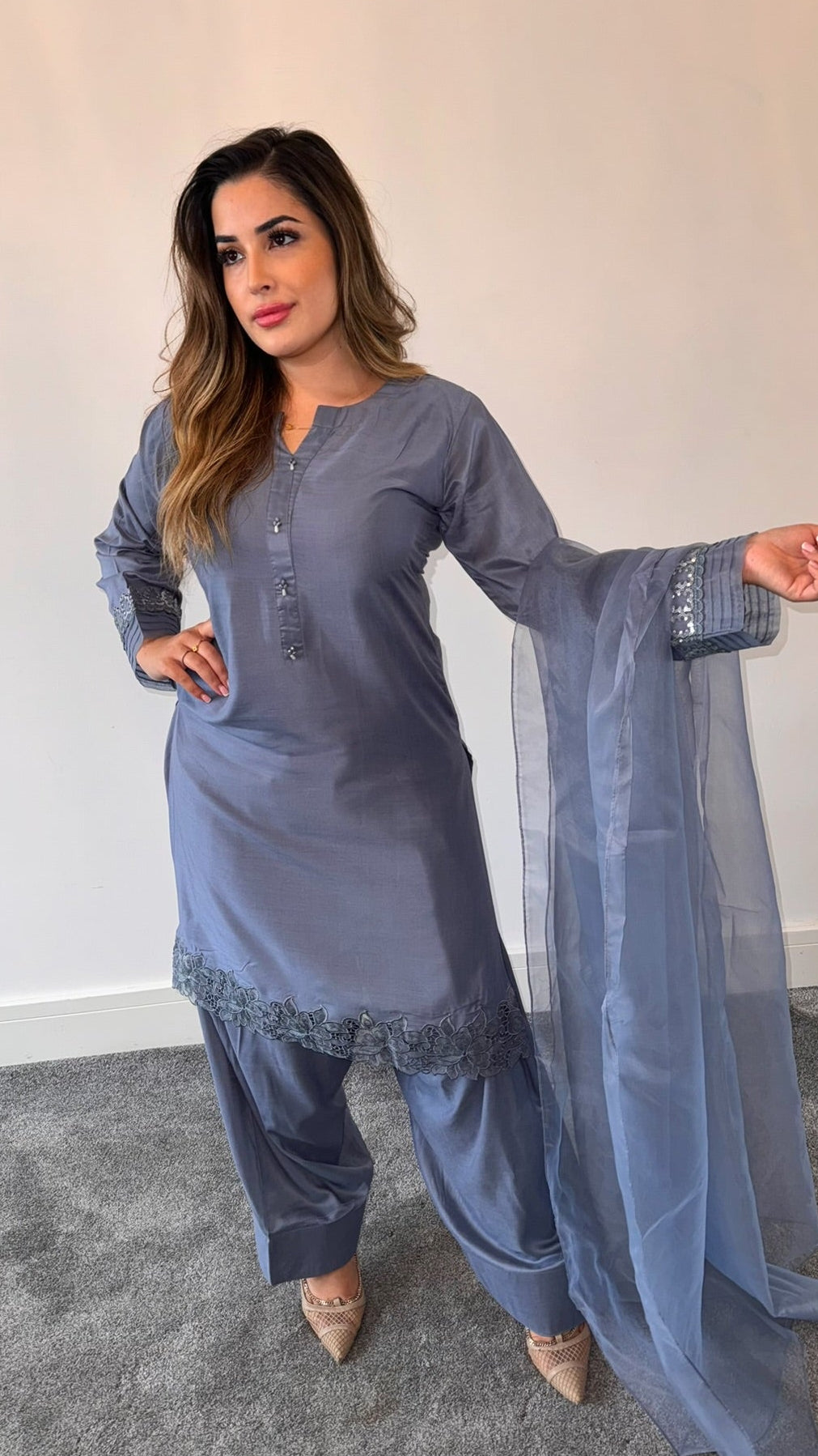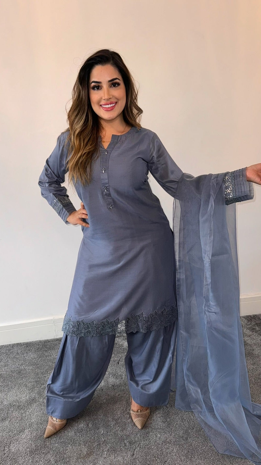 The outfit is elevated with delicate lace detailing along the hem and sleeves, while the organza dupatta adds a soft, elegant finish that drapes beautifully. Perfect for semi-formal gatherings, dinners, or festive wear.